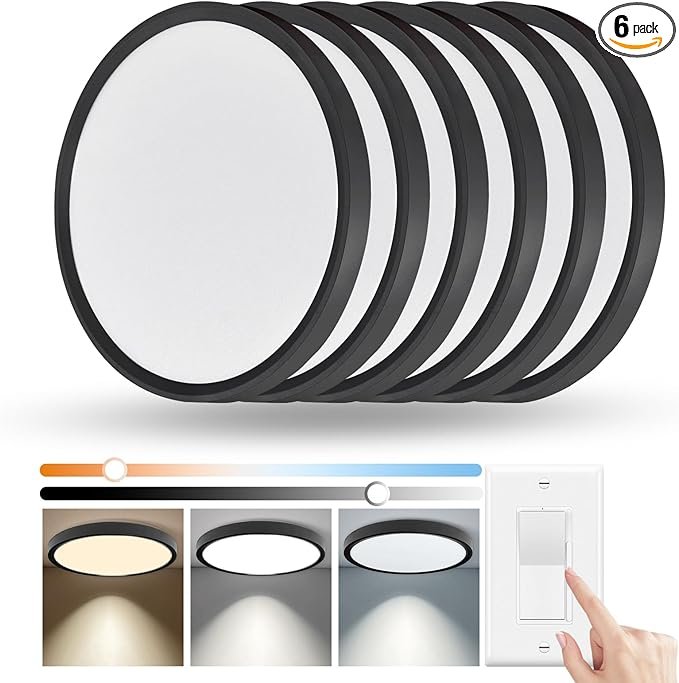 6 Pack 12 Inch Slim Dimmable LED Flush Mount Ceiling Light Fixtures, 24W 2640LM 3000K/4000K/5000K, House Upgrade Led Lights for Bedroom Hallway Laundry Room Rental Units, 240W Equiv., Black