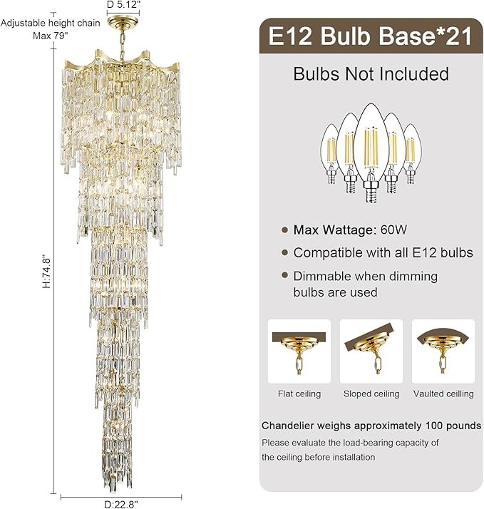 Dimensions and Weight – Size: W22.8” (58cm)x H78.7” (200cm), Adjustable cord (Max):79”(200cm), package about 100lb(45.6kg). Tips: Large chandeliers need to be installed with a professional electrician.