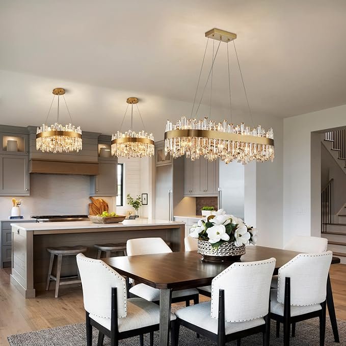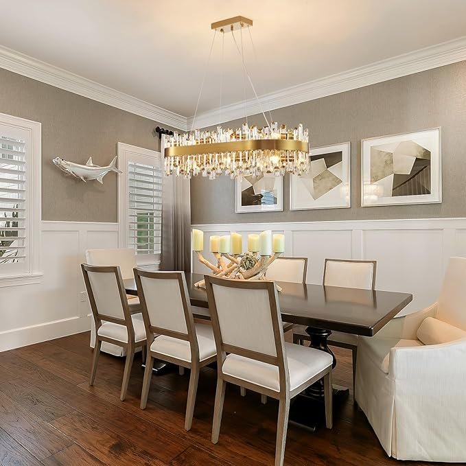â¨ăLuxury Gold Crystal Chandelieră: This gold rectangular crystal chandelier is a statement piece that can transform the ambiance of any space. The beautiful raindrop crystals refract the light to produce a warm & soft lighting ambiance that enhances the aesthetic of your dining room. Suitable for dining room, living room, kitchen island, bedroom, pool table, home office, hallway, bathroom, patio, foyer, etc.